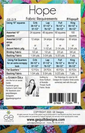 From G. E. Designs By Erla, Gudrun In Quilts Hope is a fun and easy pattern you can make from fat quarters or 10" squares and 2-1/2" strips. Construction is very easy with the Stripology XL or the Stripology Squared ruler by GE Designs. Instructions for using regular rulers are included. The pattern comes with 4 different size options: crib, lap, full, king.