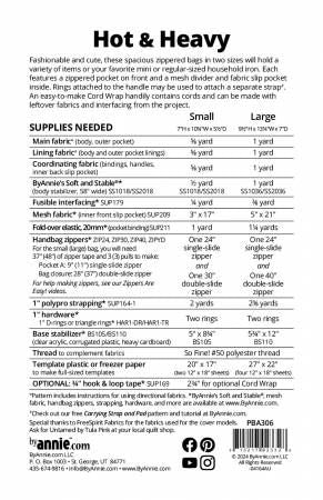 From ByAnnie By Unrein, Annie In Bags, Purses, Totes & Electronic Covers Fashionable and cute, these spacious zippered bags in two sizes will hold a variety of items or your favorite mini or regular-sized household iron. Each features a zippered pocket on front and a mesh divider and fabric slip pocket inside. Rings attached to the handle may be used to attach a separate strap. (Check out ByAnnie's free Carrying Strap and Pad course to make a separate, detachable strap.) An easy-to-make Cord Wrap handily contains cords and can be made with leftover fabrics and interfacing from the project. The pattern includes complete step-by-step instructions for purses/iron carriers in two sizes: SMALL: 7""H x 10¼""W x 5½""D (sized to carry popular mini irons) LARGE: 9½""H x 13¼""W x 7""D (sized to carry most regular-sized irons) CLASS INFO: Hot & Heavy makes a great class for confident beginners to advanced makers. We'd suggest TWO four-hour classes for students to make either the small or the large bag. The pattern includes instructions for cases in two sizes. The process is the same for each size, so students can choose a size that will best fit their needs. As always, we'd ask students to read the pattern and watch the full step-by-step Add-on Video for this project before coming to class. To make best use of class time, we also recommend that they come to class with everything cut out for the size bag that they are making. So, they should complete all of step I. CUT AND QUILT on pages 2 and 3 of the pattern BEFORE coming to class. We would suggest completing these steps in each class: Class 1: Complete steps II. Prepare Components. Complete step III. Prepare Pockets. Show demos for each step so that students can understand concepts and finish any incomplete steps as homework before the next class. Class 2: Complete step IV. Assemble the Bag. As time allows, demonstrate steps for the Cord Wrap for students to complete on their own. Visit ByAnnie.com for a Class Supply List for Hot & Heavy. Add-on Video notice: There is an Add-on Video™¿ available for this pattern. The Add-on Video™¿ is specially designed to support specific parts of the pattern and help the customer learn our best techniques. It doesn't replace the pattern -- it will enhance their sewing experience. To support local quilt shops, related paper patterns include a coupon for the value of the Add-on Video™¿. This is a $5.00 value. Customers can then use the coupon to get the video for free on the ByAnnie.com website.