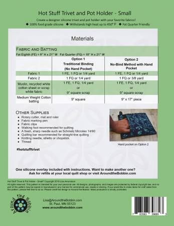 From Around the Bobbin By Amundson, Lisa In Aprons, Dish Towels, and Hot Helpers Create a designer silicone trivet - pot holder with your favorite fabrics. Transparent 6-1/2 in silicone overlay and instructions included. Makes a finished trivet - pot holder approximately 8 in. Two options included in instructions–make without a hand pocket and bind it or add the hand pocket and finish with a no-bind method. Silicone overlay is 100% food grade silicone and heat resistant up to 450 degrees. Refill silicone overlays available.
