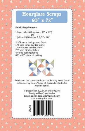 From Coriander Quilts By Yoder, Corey In Quilts Hourglass Scraps is a great, scrappy quilt that can be made with either a layer cake or a jelly roll. It finishes at 60" x 72" and features fabrics from the Peachy Keen fabric line by Corey Yoder of Coriander Quilts. Printed Paper Pattern Finished Size: 60in x 72in Final Product: Quilt Technique Used: Standard Machine Sewing Skill Level: Intermediate