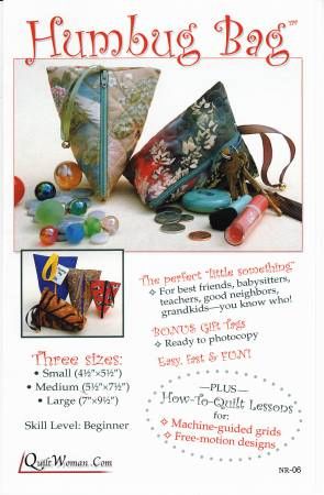Humbug Bag is a twisted tote that makes a perfect "little something" gift--for teachers, grandkids, neighbors, babysitters, etc. The shape is based on a traditional 19th century English candy, from which the bag takes its name. These are exceptionally quick, easy, and fun to make (make one in less than an hour). This is a terrific pattern for someone just learning to quilt... but great, too, for experienced quilters who just can't seem to find time to work on a "real" quilt but crave a quick quilting fix! This small project also makes a great canvas for embroiderers and beaders to practice their skills. Your "something extra" with this pattern: A sheet of gift tags, ready to photocopy. Simply cut them apart and sign to give your gift a very professional polish. Humbug Bag is a twisted tote that makes a perfect "little something" gift--for teachers, grandkids, neighbors, babysitters, etc. The shape is based on a traditional 19th century English candy, from which the bag takes its name. These are exceptionally quick, easy, and fun to make (make one in less than an hour). This is a terrific pattern for someone just learning to quilt... but great, too, for experienced quilters who just can't seem to find time to work on a "real" quilt but crave a quick quilting fix! This small project also makes a great canvas for embroiderers and beaders to practice their skills. Your "something extra" with this pattern: A sheet of gift tags, ready to photocopy. Simply cut them apart and sign to give your gift a very professional polish.