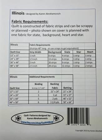 From Karen Abrahamovich By Abrahamovich, Karen In Quilts Illinois- A quilt Pattern in 4 Sizes! Illinois, known as the Prairie State, home of Chicago and Land of Lincoln. The finished quilt size is determined by the width of the strips used for construction. Strip widths range from 1" to 2.5" and a detailed construction "map" guides provides details needed to produce a great quilt! Quilt size options are 13" x 15", 24" x 29", 36" x 44", 48" x 58". Sizes vary for multiple wall hanging options (the smallest also is a great size for a pillow) or go big for a great throw quilt.