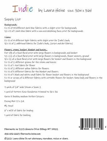 From Fiberworks Inc By Heine, Laura In Quilts Indie….The Llama Collage Pattern by Laura Heine. This pattern includes full color and step by step instructions to create this beautiful Llama. Adding the floral and blue backgrounds makes Indie stunning. Finished size 30in x 36in Printed Paper Pattern Final Product: Wall Hanging Finished Size: 30in x 36in Technique: Standard Machine Sewing Templates included: Yes - Paper Templates Skill Level: Beginner