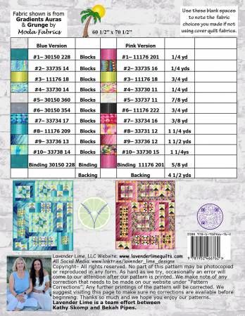 From Lavender Lime Quilting In Quilting - General Island Time show cases the beautiful fabrics from the Gradients Auras by Moda Fabrics. Quilt measures 60 1/2" x 70 1/2". The large blocks will make the quilt go together so quickly. Any beautiful print would look amazing in the fast quilt. Softcover