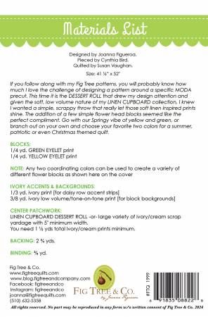 From Fig Tree Quilts By Figueroa, Joanna In Quilts January Blooms If you follow along with my Fig Tree patterns, you will probably know how much I love the challenge of designing a pattern around a specific MODA precut. This time it is the DESSERT ROLL that drew my design attention and given the soft, low volume nature of my LINEN CUPBOARD collection, I knew I wanted a simple, scrappy throw that really let those soft linen inspired prints shine. The addition of a few simple flower head blocks seemed like the perfect compliment. Go with our Springy vibe of yellow and green, or branch out on your own and choose your favorite two colors for a summer, patriotic or even Christmas themed quilt. SIZE: 41.5" x 52" Printed Paper Pattern Finished Size: 41-1/2in x 52in Final Product: Quilt Technique Used: Standard Machine Sewing Skill Level: Confident Beginner