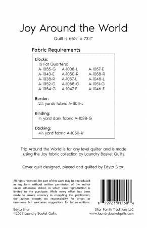 From Laundry Basket Quilts By Sitar, Edyta In Quilts Joy Around the World is for any level quilter! Quilt features the Joy collection designed by Edyta Sitar for Andover. Printed Paper Pattern Finished Size: 65-1/2in x 73-1/2in Final Product: Quilt Technique Used: Standard Machine Sewing Skill Level: Any Level