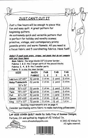 From All Washed Up By Davy, Angela and Andersen, Louise, In Quilts This is so fun. You pick a great focus fabric (that's too awesome to cut up into little pieces) and pick your size there are 7 sizes to choose from. This is one that you will make over and over again. Just a few hours will be enough to piece this fun and easy quilt A great pattern for beginning quilters. An extremely quick and versatile pattern that is great for holiday and novelty scenes, primitive, vintage or contemporary prints, juvenile prints or warm flannels. Lap 63in x 87in, Baby 51in x 51in, Child 51in x 63in, Twin 75in x 87in, Full 81in x 93in, Queen 105in x 105in and King 117in x 117in Printed Paper Pattern Finished Size: Various Final Product: Quilt Technique Used: Standard Machine Sewing Skill Level: Beginner
