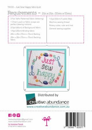 From Creative Abundance By Flendt, Jemima of Tied With A Ribbon In Quilts Just sew Happy is a new play on words fun Mini Quilt. Featuring your favorite sewing notions this Mini Quilt will be perfect for your sewing space or great for when you need a Quilt Swap project. You can choose your favorite Method of Applique for this Mini Quilt - either by machine or hand! Finished Mini Quilt size - 21in x 21in. Designed by Jemima Flendt of Tied with a Ribbon