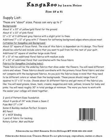 From Fiberworks Inc By Heine, Laura In Quilts KangaRoo Collage Pattern by Laura Heine. Jump right in to this fun collage with the world's largest Marsupial and her joey. This would be a perfect quilt to brighten any room with the bold fabric colors. Pattern includes full size insert and color step by step instructions. Finished size 23x31. Printed Paper Pattern Finished Size: 23in x 31in Final Product: Wall Hanging Paper Templates Included Technique Used: Standard Machine Sewing Skill Level: Confident Beginner