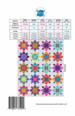 From Kustom Kwilts By Marsh, Joanna In Quilts The Kapow! quilt pattern features six different options, including baby, throw, full, twin, queen, and king sizes. Kapow! is fat quarter friendly and is inspired by fireworks in the night sky. Fat quarter friendly! 8.5" x 5.5" booklet pattern includes a coloring page for each option and fabric amounts required for each size. Backing assembly instructions for each size are included. Colorful, easy to read diagrams and written instructions walk you through each step. Detailed cutting diagrams AND a cutting checklist are included for ease of use. The finished size options include the following: Baby – 48" x 48" Throw – 48" x 64" Twin – 72" x 88" Full – 80" x 96" Queen – 96" x 96" King – 104" x 104" Skill level is confident beginner to intermediate. Printed Paper Pattern Finished Size: Multiple Final Product: Quilt Paper Templates Included Technique Used: Standard Machine Sewing Skill Level: Confident Beginner