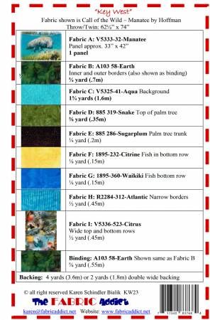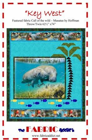 From Fabric Addict In Quilts Key West quilt pattern. Throw/Twin size. Fits any horizontal (33" x 42") panel. Traditionally pieced (not paper-pieced). Uses Call of the Wild fabric by Hoffman. Printed Paper Pattern Finished Size: 62-1/2in x 74in Final Product: Quilt Technique Used: Standard Machine Sewing Skill Level: Intermediate