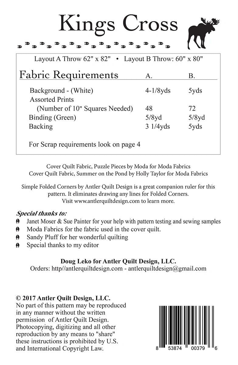 Kings Cross is a bold, dramatic pattern that is layer cake friendly. Choose between 2 layout options. This is a great pattern for a mystery or class. Layout A Throw: 62in x 82in; Layout B Throw: 60in x 80in.