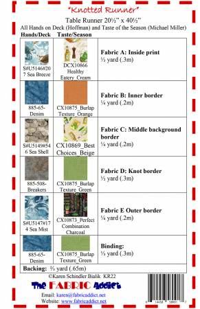 From Fabric Addict By Schindler, Karen In Placemats, Table Runners & Toppers Knotted Runner table runner pattern uses either All Hands on Deck by Hoffman or Taste of the Season by Michael Miller. Printed Paper Pattern Finished Size: 20-1/2in x 40-1/2in Final Product: Table Runner / Table Topper / Placemat Technique Used: Standard Machine Sewing Skill Level: Confident Beginner