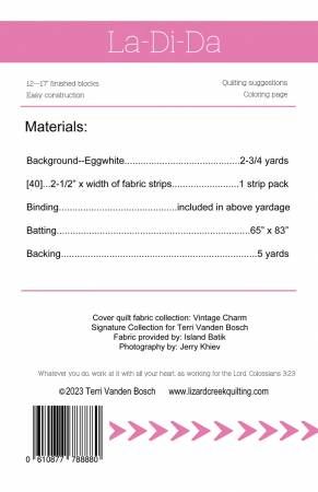 From Lizard Creek Quilting By Vanden Bosch, Terri In Quilts La-Di-Da is an impressive and upscale looking quilt that is constructed in a down home way using only a 2-1/2" strip pack and background fabric.This 61" x 79" project works up super quick with 17" finished blocks. Easy to use fabric placement charts for designing with other 2-1/2" strip packs. Not your typical strip pack project. Pattern includes charts for fabric placements, detailed cutting and piecing instructions, quilting suggestions and coloring page. Cover quilt was made with my Signature fabric collection--Vintage Charm by Island Batik. Printed Paper Pattern Finished Size: 61in x 79in Final Product: Quilt Technique Used: Standard Machine Sewing Skill Level: Beginner