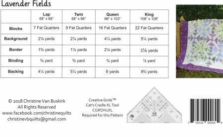 From Christine Quilts By Van Buskirk, Christine In Quilts This Fat Quarter friendly quilt has options from Lap to King size! Blocks are simple to make using Creative Grids Extra Large Cat's Cradle Tool, CGRDH1XL. Lap: 68in x 68in, Twin: 68in x 86in, Queen: 86in x 103in, King: 108in x 108in