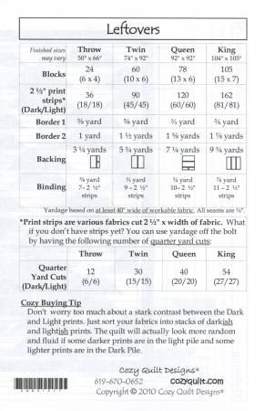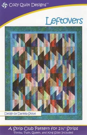 From Cozy Quilt Designs By Stout, Daniela In Quilts Leftovers A Strip Club Pattern Designed for 2½” Strips! This wonderful pattern uses nothing but 2½" strips and borders! It is dazzling in batik strips but also looks good in prints, florals, tonals… almost anything you can separate into lightish and darkish values. It's also a perfect pattern for those leftover pieces from the tube technique! The pattern includes instructions for: Throw 50in x 66in Twin 74in x 92in Queen 92in x 92in King 104in x 105in