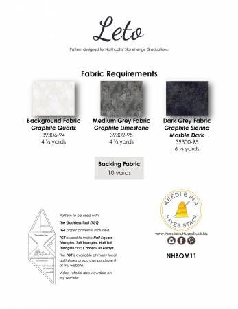 From Needle In A Hayes Stack By Hayes, Tiffany In Quilts The Leto is not the traditional sampler quilt. It is a celestial masterpieces in shades of grey (sample is made with Northcotts' Stonehenge Graduations). The finished quilt measures 106" x 106". 11-Month Block Series. Each month there is a new block to make and instead of making one you will make several of the same block. The blocks in this quilt are all created with straight line piecing. This quilt can be made by a confident beginner. The pattern suggests using The Goddess Tool to quickly and easily create corner cut-aways, half square triangles, tall triangles and half tall triangles. Printed Paper Pattern Finished Size: 106in x 106in Final Product: Quilt Paper Templates Included Technique Used: Standard Machine Sewing Skill Level: Confident Beginner