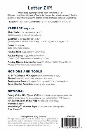 From Atkinson Designs By Atkinson, Terry In Bags, Purses, Totes & Electronic Covers These easy zipper pouches spell fun from A - Z! Why not recycle an old pair of jeans for the perfect shade of blue? Denim is perfect paired with colorful cotton prints. Includes optional wrist straps. Finished sizes: Large 9.5" x 5" x 2.5" Medium 8" x 4.5" x 2" Mini 6" x 3.5" x 1.5"