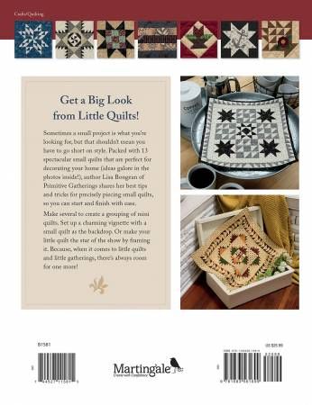From Martingale By Bongean, Lisa WRAPUPSALE_2024 Collection In Quilting - General Sometimes a small project is what you’re looking for, but that shouldn’t mean you have to go short on style. Packed with 13 spectacular small quilts that are perfect for decorating your home (ideas galore in the photos inside!), author Lisa Bongean of Primitive Gatherings shares her best tips and tricks for precisely piecing small quilts, so you can start and finish with ease. Make several to create a grouping of mini quilts. Set up a charming vignette with a small quilt as the backdrop. Or make your little quilt the star of the show by framing it. Because, when it comes to little quilts and little gatherings, there’s always room for one more! Pages: 80 Author: Lisa Bongean Publish Date: 01/01/2022 Dimensions: 8-3/8in x 10-7/8in Softcover