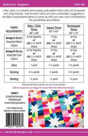 From Modernly Morgan By McCollough, Morgan In Quilts Little Lights is a cheerful and scrappy star quilt pattern that is jelly roll, fat quarter and scrap friendly. Use the warm and cool color combination suggested in the fabric requirements or come up with your own color combinations! The possibilities are endless! Printed Paper Pattern Finished Size: Baby/Child Throw 48in x 48in, Throw 60in x 60in and Rectangular 60in x 70in Final Product: Quilt Technique Used: Standard Machine Sewing Skill Level: Beginner