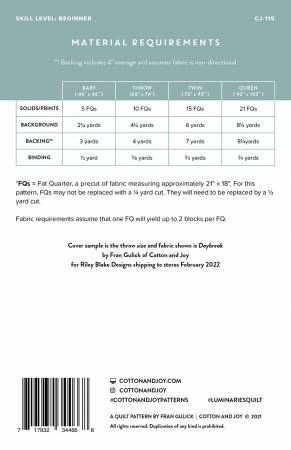 From Cotton and Joy In Quilts The Luminaries quilt pattern is a fun mix-and-match pattern, perfect for beginners. This block-based pattern is fat quarter friendly and the perfect pattern to try whether your tastes are traditional, modern, or somewhere in between. Pattern includes multiple sizes: baby, throw, twin, and queen. Printed Paper Pattern Final Product: Quilt Finished Size: 58in x 72in Skill Level: Beginner