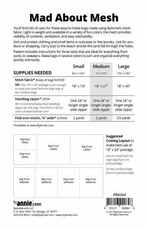 From ByAnnie By Unrein, Annie In Bags, Purses, Totes & Electronic Covers You'll find lots of uses for these easy-to make bags in three sizes made using ByAnnie's mesh fabric. Light in weight and available in a variety of fun colors, the mesh provides visibility of contents, ventilation, and easy washability. Sort and protect clothing and small items in suitcases or in the laundry. Use for produce or shopping. Carry toys to the beach and let the sand fall through the holes. Pattern includes instructions for three sizes that are ideal for everything from socks to sweaters. Make bags in several colors to sort and organize everything quickly and easily. Uses ByAnnie's handbag zippers: ZIP24-xxx and Fold-over elastic: SUP206-xxx