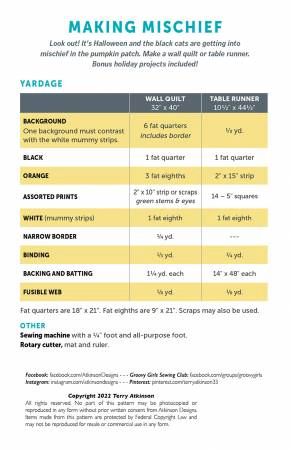 From Atkinson Designs By Atkinson, Terry In Placemats, Table Runners & Toppers Look out! It's Halloween and the black cats are getting into mischief in the pumpkin patch. Make a wall quilt or table runner. Bonus holiday projects included! Printed Paper Pattern Finished Size: 32in x 40in & 10-1/2in x 44-1/2in Final Product: Placemat / Table Runner / Table Topper Technique Used: Standard Machine Sewing Skill Level: Confident Beginner