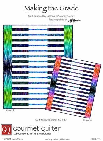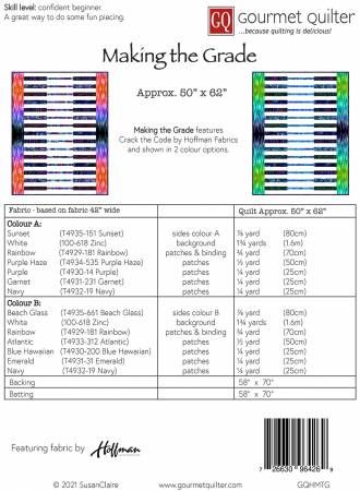 From Gourmet Quilter By Mayfield, Susan Claire In Quilts Making the Grade is a pieced quilt shown in 2 colourways and measures 50in x 62in. The quilt features Carck the Code fabrics by Hoffman Fabrics. Printed Paper Pattern Final Product: Quilt Finished Size: 50in x 62in Technique: Standard Machine Sewing Skill Level: Confident Beginn