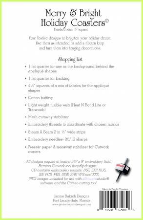 From Janine Babich Designs By Babich, Janine In Coasters and Mug Rugs A delightful set of “Made in the Hoop “ coasters that will add a dash of color to your holiday decor. pattern includes JPEG images for use with cutting machines. Requires a 5-3/4in x 9in hoop. File formats included: DST, EXP, HUS, PCS, PES, SEW, SHV, VP3 & XXX Finished size: 5in square. Digital Download Code Finished Size: 5in Square Final Product: Home Decor Technique Used: Applique/Machine Embroidery Skill Level: Beginner