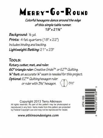 From Atkinson Designs By Atkinson, Terry In Placemats, Table Runners & Toppers Colorful hexagons dance around the edge of this simple table runner. No "Y" seams, just sew simple rows. Easy to kit! Four fat quarters includes hexies, binding and backing. Uses Creative Grids 60 degree triangle ruler, Instructions show how to cut hexies with or without a hexagon ruler; our testers loved it both ways. Sure to be a hit for your Summer schedule.