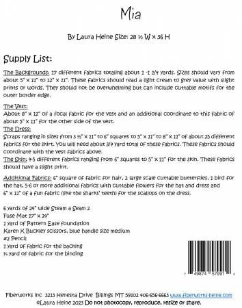 From Fiberworks Inc By Heine, Laura In Quilts Mia Collage Pattern by Laura Heine. Mia is a scaled down version of the ever popular "The Dress" pattern. This collage has brightly colored fabrics with a BOHO look that will complement anyone's home. This pattern includes full sized patterns and complete color instruction on how to complete the collage quilt. Printed Paper Pattern Finished size 28 1/2x36. Final Product: Wall Hanging Paper Templates Included Technique Used: Standard Machine Sewing Skill Level: Confident Beginner
