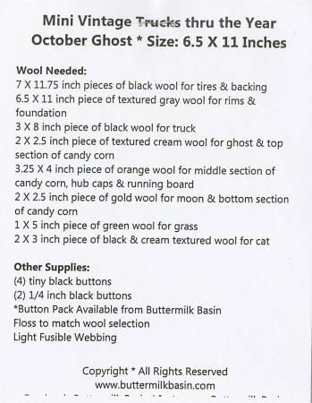 From Buttermilk Basin By West, Stacy In Wool This is 1 design in a series of 12 MINI, monthly themed trucks inspired by the love of those old vintage trucks our dads & grandpas had!! These mats are quick & easy to make and kit up! They are also just the right size, measuring 6.5 X 11 inches. They are perfect for a monthly club!