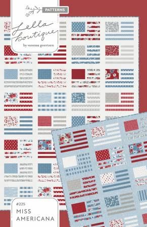 From Lella Boutique By Goertzen, Vanessa In Quilts She's beauty and she's grace... and she's a cool new patriotic quilt from the imagination of Lella Boutique. "Miss Americana" is a cool spin on an American flag quilt in the sweetest reds, whites, blues - with a fun pop of grey in the mix. Make it with fat quarters - or use a Honeybun/fat quarter combo. The hardest thing about this quilt is deciding which background color to use! Finished Block: 6-3/4" x 10-1/2" Finished Quilt: 65" x 72-1/2" Skill Level: Advanced Beginner MATERIALS NEEDED: (20) fat quarters* 3-5/8 yard background fabric 3/4 yard binding fabric 4-1/4 yards backing fabric 73” x 81” batting *You could substitute (1) Honeybun (40 strips 1-1/2" x WOF) + (7) fat eighths in place of the (20) fat quarters. Fabric is Old Glory by Lella Boutique for Moda Fabrics (Feb 2024).