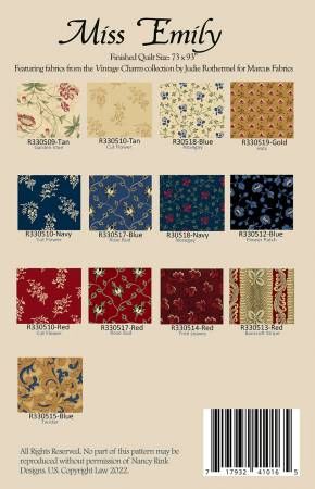 From Nancy Rink Designs By Rink, Nancy In Quilts Clever piecing creates an on point look in this straight set quilt. Use vintage inspired fabrics like those shown or dive into your favorite fat quarter bundle to make a variety of star blocks. Printed Paper Pattern Finished Size: 73in x 93in Final Product: Wall Hanging Technique Used: Standard Machine Sewing Skill Level: Beginner