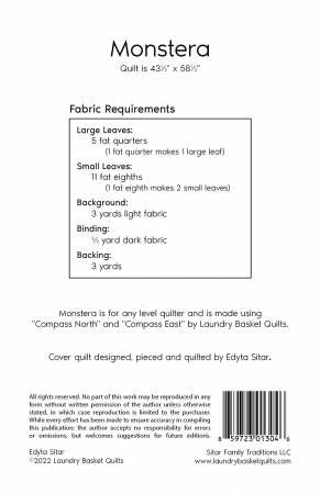 From Laundry Basket Quilts By Sitar, Edyta In Quilts "Monstera" Original Appliqué Laundry Basket Quilts Pattern using "Compass South" and "Compass East" fabric collections by Edyta Sitar for Andover. Perfect for any level quilter! Quilt Size is 43½" x 58½" Printed Paper Pattern Finished Size: 43-1/2in x 58-1/2in Final Product: Quilt Paper Templates Included Technique Used: Applique Skill Level: Any Level