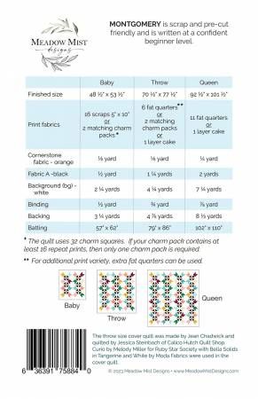 From Meadow Mist Designs By Brickey, Cheryl In Quilts Montgomery combines shoo fly and petal blocks for a complicated looking design that is easy to piece. The pattern is scrap and pre-cut friendly and is written at a confident beginner level. Quilters can use charm pack, layer cake, fat quarter, or scraps to make the quilt. The pattern includes instructions for a baby, throw, and queen sized quilts. Printed Paper Pattern Finished Size: 70-1/2in x 77-1/2in Final Product: Quilt Technique Used: Standard Machine Sewing Skill Level: Confident Beginner