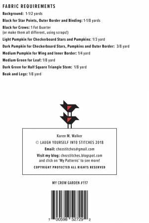 From Laugh Yourself Into Stitches By Walker, Karen In Quilts This Pumpkin Patch is ripe and ready for harvest and the crows have the first pick! Checkerboard pumpkins and star centers give this quilt so much texture with bright green leaves giving way into a crisp white background. My Crow Garden has been successfully made in muted colors too, with a certain dirty white grunge background charm. Measures 44” x 46” and is divided into sections with a clear graphic illustration to compliment the written instructions. Upsized leg pieces make them easier to handle and are trimmed down after sewn together, creating more accuracy. Traditional rotary cutting methods are used in My Crow Garden. This quilt is one in a series of 3. Cherry Pick’n and Star Spangled Picnic are currently available with a 4th addition coming out Fall 2022.