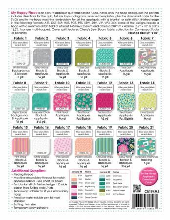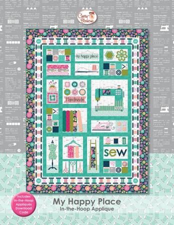 From Cherry Blossoms By Guidry, Cherry In Quilts My Happy Place is an easy to applique quilt that can be fused, hand, or in-the-hoop appliqued! The pattern includes directions for the quilt, full size layout diagrams, reversed templates, plus the download code for the SVGs and in-the-hoop machine embroidery for all the appliqués with a blanket or satin stitch finished edge in the following formats: ART, DST, EXP, HUS, PCS, PES, SEW, SHV, VIP, VP3, XXX; some of the designs require a hoop with a minimum stitch field of at least 145mm x 255mm and others a 210mm x 400mm (5.7 x 10 & 8.3 x 16.2); four are multi-hooped. Cover quilt features Cherry's Sew Bloom fabric collection for Contempo Studio of Benartex. Printed Paper Pattern Finished Size: 59in x 80in Final Product: Quilt Downloadable Codes Included Technique Used: Machine Embroidery Skill Level: Intermediate