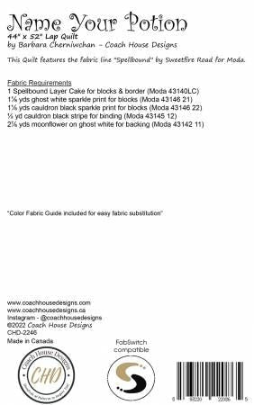 From Coach House Designs By Cherniwchan, Barbara In Quilts 44" x 52" Halloween lap quilt featuring Spellbound fabric line by Sweetfire Road. Uses a layer cake and depicts witch's hats, magic wands and potion bottles. Applique numbers on bottles. Printed Paper Pattern Finished Size: 44in x 52in Final Product: Quilt Paper Templates Included Technique Used: Applique Skill Level: Confident Beginner