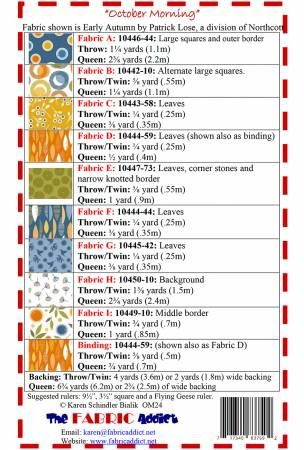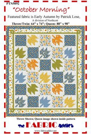 From Fabric Addict By Schindler, Karen In Quilts October Morning quilt pattern. Includes 2 sizes: Throw/Twin and Queen. Easy to piece maple leaf blocks. Features a unique simple knotted border with corners. Printed Paper Pattern Finished Size: 64in x 74in & 88in x 98in Final Product: Quilt Technique Used: Standard Machine Sewing Skill Level: Confident Beginner