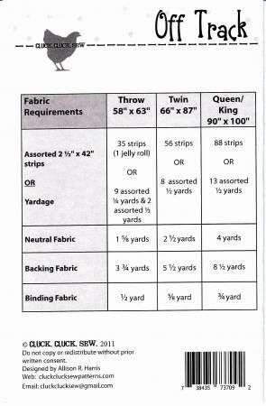 From Cluck Cluck Sew By Harris, Allison In Quilts Off Track is a fun beginner pattern. It can use a jelly roll, scrap strips or strips from your favorite fabrics. The pattern comes with the option of making a throw 58in x 63in, twin 66in x 87in, or queen/king 90in x 100in sized quilt.