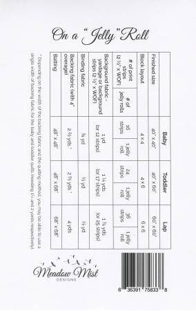 From Meadow Mist Designs By Brickey, Cheryl In Quilts On a "Jelly" Roll is a jelly roll (also known as a design roll or 2 1/2" strip roll) friendly pattern. The pattern is written in at a confident beginner level and contains a coloring sheet to audition possible color schemes and fabrics. On a "Jelly" Roll includes instructions for three sizes: baby, toddler, and lap.
