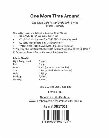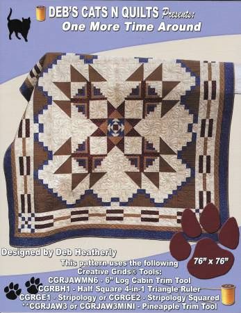 From Deb's Cats N Quilts By Heatherly, Deb In Quilts One More Time Around (76" x 76") is the third quilt in the 'Grids Girls' series. This pattern is great for teaching your customers about Creative Grids tools and offers options for which CGR tools you use in the center block and corner squares. Just like Around We Go (the first quilt in the series), and Around We Go Again (the second quilt in the series) , this pattern calls for 4 fabrics plus a background which makes this pattern easy for your customers to choose fabrics, or for you to kit.