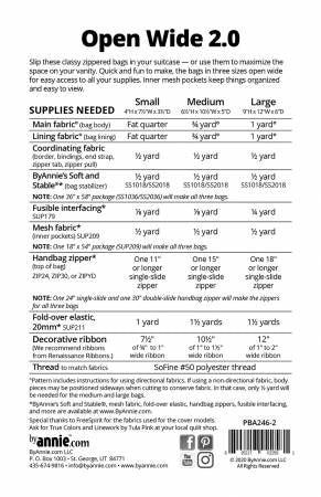 Quick and fun to make, these bags in three sizes open wide for easy access to all your supplies. Binding on the easy-to-install zipper finishes the upper edges and forms a handle and grab tab. Two inner mesh pockets keep things organized and easy to view. Soft and StableR provides great body and stability and ensures that the bags stand up and hold their shape. Slip these classy zippered bags in your suitcase — or use them to maximize the space on your vanity. Be sure to make a few Open Wide 2.0 bags to have on hand for gifts. Who wouldn’t love a cute bag for cosmetics or other supplies? The pattern includes complete step-by-step instructions for bags in three sizes: Small: 4in (H) x 7.5in (W) x 3.5in (D) Medium: 6.5in (H) x 10.5in (W) x 5in (D) Large: 9in (H) x 12in (W) x 6in (D) NOTE TO SHOP OWNERS: Open Wide 2.0 is an update of Open Wide which was released in 2016. Just like a new edition of a textbook, this new version of the pattern features improved design and layout, easier-to-follow steps and diagrams, and our newest and best techniques. We have also filmed an Add-On Video for the project to help you and your customers make these bags. Since the Open Wide 2.0 pattern includes a coupon to get the Add-On Video at no charge, we would recommend that they purchase the new and improved version of the pattern. Printed Paper Pattern Final Product: Bag Finished Size: 4in (H) x 7.5in (W) x 3.5in (D), 6.5in (H) x 10.5in (W) x 5in (D) and 9in (H) x 12in (W) x 6in (D) Technique: Standard Machine Sewing