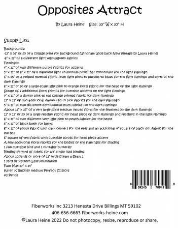From Fiberworks Inc By Heine, Laura In Quilts Opposites Attract Collage Pattern by Laura Heine. Add these tropical and enchanting flamingos to brighten any room in your home with these vibrant pink fabrics. Includes color step by step instructions and full size pattern to complete this quilt. Finished size 30x30. Printed Paper Pattern Finished Size: 30in x 30in Final Product: Wall Hanging Paper Templates Included Technique Used: Standard Machine Sewing Skill Level: Beginner