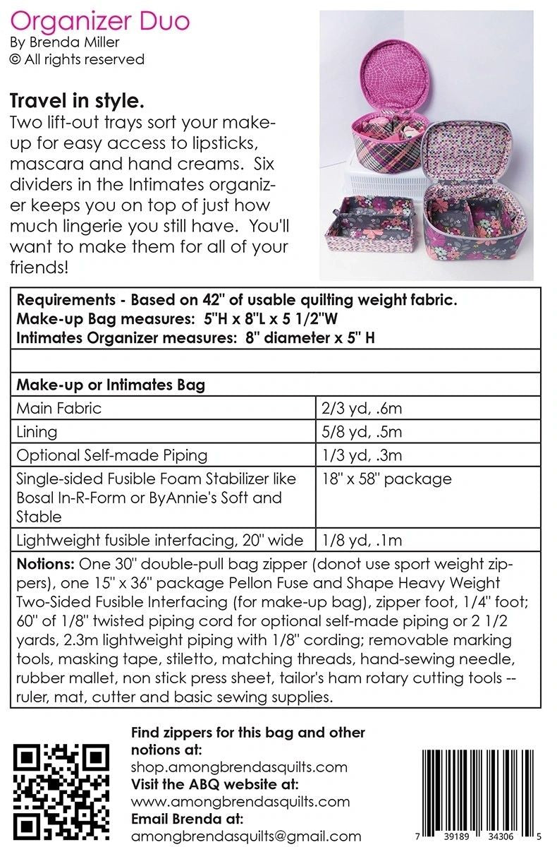 From Among Brenda's Quilts & Bags By Miller, Brenda In Bags, Purses, Totes & Electronic Covers Two lift-out trays sort your makeup, jewelry, cords, sewing notions or what have you. Six dividers in the Intimates Organizer keeps lingerie, socks and undies in order. A great travel set! The make-up organizer fits nicely in the Voyager Bag, ABQ-175. Makeup Bag: 5in H x 8in L x 5-1/2in W, Intimates Bag: 8in diameter x 5in H