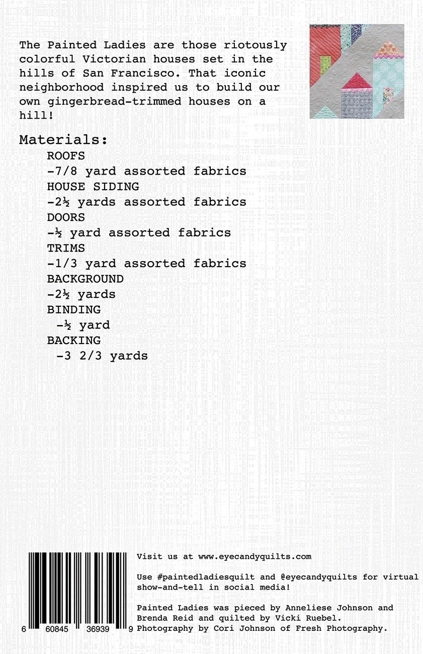 From Eye Candy Quilts In Quilts Painted Ladies is 60in x 72in. The Painted Ladies are those riotously colorful Victorian homes set in the hills of San Franciso. That iconic neighborhood inspired us to build our own gingerbread-trimmed houses on a hill. The pattern is four pages plus one template page.