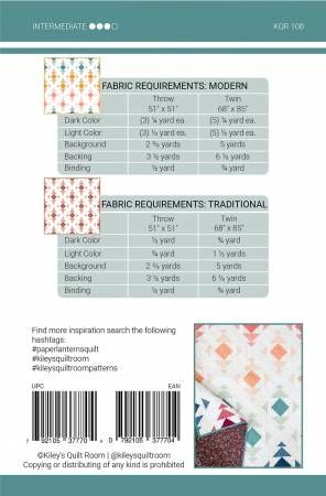 From Kiley's Quilt Room By Ferons, Kiley In Quilts This is an Intermediate pattern. It is one block repeated on point. The "sashing" is built into each block. Precision is key with this pattern to make points line up. This pattern is a great way to show an ombre effect of color. This pattern comes in a 5.5 x 8.5 paper booklet bound pattern. Printed Paper Pattern Finished Size: 51in x 51in & 68in x 85in Final Product: Quilt Technique Used: Standard Machine Sewing Skill level: Intermediate