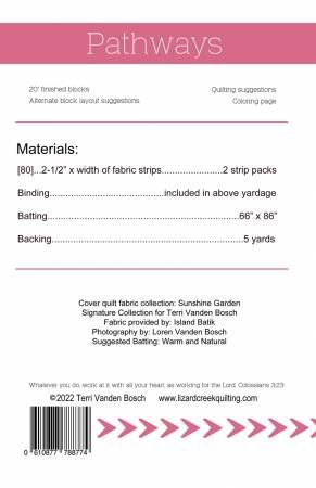 From Lizard Creek Quilting By Vanden Bosch, Terri In Quilts Pick your Pathway--multiple layout options in pattern. Pre cut friendly. Quilt will use up 2 complete 2-1/2" strip rolls--including the binding. Detailed cutting instructions to create 12--20" finished blocks. Coloring page and quilting suggestions. Fabrics are from my Signature Fabric Collection--Sunshine Garden by Island Batik. Encourage customers to buy and use up their hoarded strip rolls!!! Printed Paper Pattern Finished Size: 60in x 80in Final Product: Quilt Technique Used: Standard Machine Sewing Skill Level: Beginner