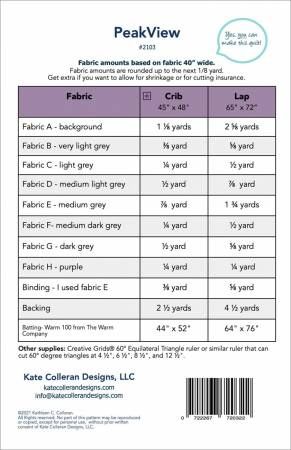 From Kate Colleran Designs By Formerly Seams Like A Dream and Colleran, Kate In Quilts Triangles form mountains and valleys - with plenty of space left open for your own quilt style. The modern quilt design really lets you play with color to create your own mountain scene. The pattern uses a 60o triangle ruler to measure and cut the triangle pieces. We recommend the Creative Grids® 60o Equilateral Triangle ruler. Two quilt sizes: 45in x 48in Crib Size, and 65in x 72in Lap Size
